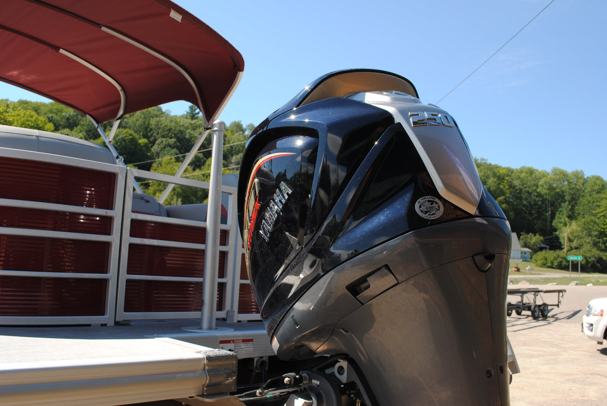 bright red tritoon with a high output 250hp Yamaha outboard, max capacity is 12 persons. Ski & tubing capable, Bimini top included, 45pmh top speed
