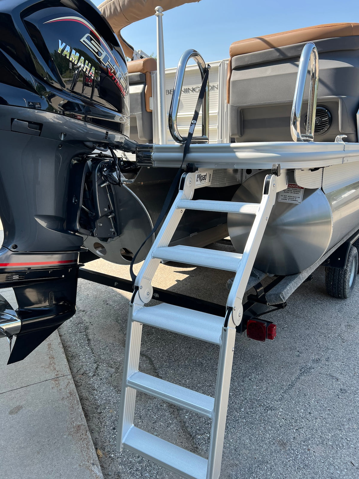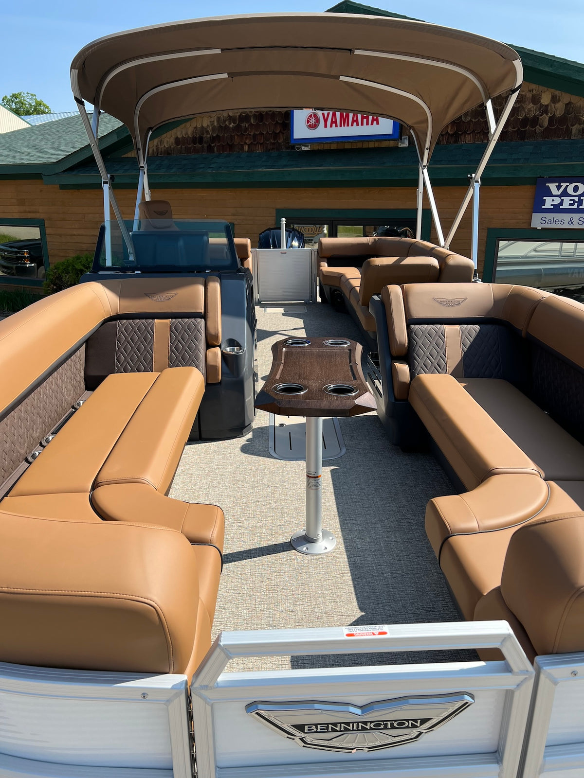 tan and ocean blue tritoon with a high output 250hp Yamaha outboard, max capacity is 12 persons. Capable of pulling skiers & tubes, Bimini included, 45mph top speed